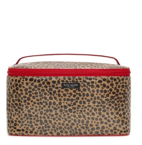 This is one of the nicest cosmetic cases we've had the chance to carry. In brand new Killington Multi fabric, which is a fun leopard print, it is chic and fun! An ultra roomy zip-around cosmetics case with another case inside. Really two bags in one! These two cosmetic cases will keep all your travel essentials (both large and small) ~ safe and organized. The lightly textured coated fabric is water and stain proof. Double zipper closure with red leather pulls. Red leather handle across top. The outside case measures 5.5"(h) x 10"(w) x 7"(d) and inside is a separate zip-around interior case. Two zippered compartments under the top and one inside the case would easily hold jewelry or other small items. Very spacious! Perfect for travel or for organizing your beauty routine at home.